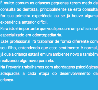 Trabalhando desta maneira a criança vai gradativamente adquirindo confiança no profissional e assim passa a colaborar com o procedimento propriamente dito. Para isso, utiliza-se técnicas modernas de condicionamento onde a criança é educada a cooperar durante o tratamento odontológico.